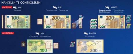 De nieuwe €100- en €200-biljetten zijn de laatste biljetten van de Europa-serie en komen vandaag in omloop. De bankbiljetten beschikken over nieuwe en innovatieve veiligheidskenmerken en zijn gemakkelijk te controleren via de ‘voel, kijk en kantel’-methode.