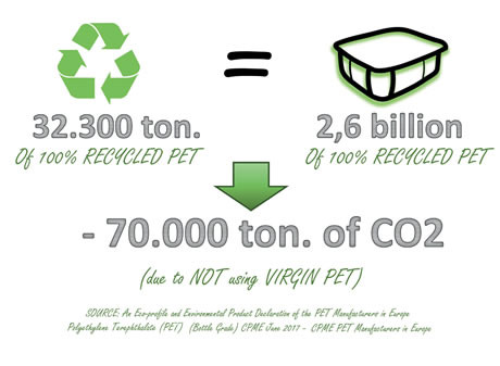 "Een tweede voordeel van 100% RPET is de veel lagere uitstoot van CO2. Bij een productie van 32.300 ton aan gerecycled PET besparen we 70.000 ton aan CO2 ten opzichte van APET. De besparing ten opzichte van de A-B-A constructie is 14.000 ton CO2 bij 80% RPET en 28.000 ton CO2 bij een 60% RPET-aandeel. Ook ten opzichte van andere materialen die milieuvriendelijker lijken, is de CO2 uitstoot van RPET lager. Naast de keuze voor RPET maken we onze schalen ook zo licht mogelijk om materiaal en CO2 uitstoot te beperken. Ook zijn de meeste schalen geschikt voor topseal om de deksels te besparen", vertelt Joop.