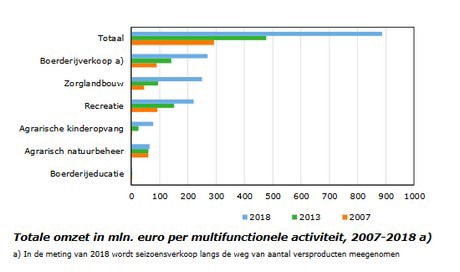 Andere activiteiten die boeren en telers ondernemen zijn 'zorglandbouw', 'recreatie', 'agrarische kinderopvang' en 'agrarisch natuurbeheer'. De kleinste bijdrage is 'boerderijeducatie' met een omzet van minder dan 1 miljoen euro.
