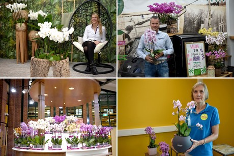 Van linksboven mee met de klok: Brenda Hanemaaijer van Kwekerij Piet Vijverberg; Marcel Moeskops van Green Balanz; Marian Bunnik van Van der Hoorn Orchideeën; en tot slot een blik in de showroom van LevoPlant