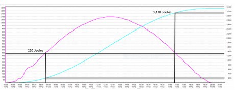 Om die vraag te beantwoorden, moeten we kijken naar een dag met 3300 joule daglicht. Dit is zeer ongebruikelijk in koele klimaten, maar komt vaak voor in warmere klimaten. Onderstaande grafiek toont een perfect zonnige dag, met een maximale lichtintensiteit van 1100 Watt (roze lijn, linkerschaal) en een totale lichtsom van meer dan 3300 joule (blauwe lijn, rechterschaal).