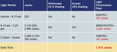 Het blijkt dat van de totale 3300 joules de combinatie van schaduw en scherm bijna 1400 joules tegenhoudt en er een respectabele hoeveelheid van 1932 joules overblijft voor de planten. De ervaring heeft geleerd dat dit voldoende is voor een optimale productie. Belangrijker nog is dat de teler de warmte van de zon, die de kas binnenkomt, kan tegenhouden. Een lagere ventilatorsnelheid kan worden gehandhaafd in combinatie met zonwering zonder opbrengstverlies en zonder dat dit ten koste gaat van het klimaat.
