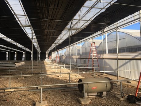 Verduisteringscherm, verwarming en ventilatie in een cannabiskas in Carpinteria, Californië.