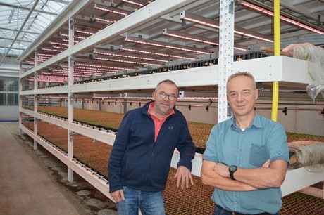 Nee … dat is het niet. De teeltzone voor de kieming en opkweek staat immers in de kas en niet in een afgesloten ruimte. En dat biedt best voordelen. Door de luchtstroming in de kas is het klimaat tussen de lagen gelijkmatig. Dat blijkt ook wel uit de proef met een plenum. De proef bevestigde het vermoeden van Christ. Het klimaat hoeft niet per laag bijgestuurd te worden. Een speciale luchtbehandelingskast is overbodig.
