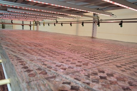 Boven iedere laag hangt LED-licht. Christ Monden ziet daar de voordelen wel van in. Zeker in het vroege stadium van de plant. De productie gaat beter. De plant is sterker en heeft meer groeikracht. Het lichtrecept is afgestemd op het gewas. Christ: "Dat was even een zoektocht, maar het resultaat is nu goed. En dit is wel rond te rekenen; de verhouding planten per m2 per kWh is nu rendabel.”