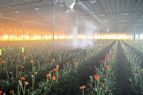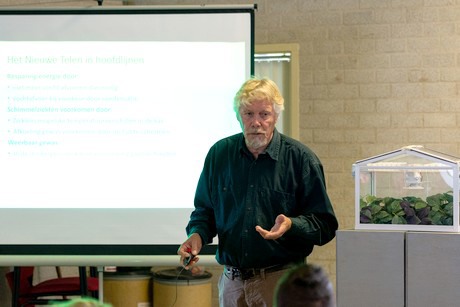 Deze kleine theoretische introductie is nodig om de werking van de Nivolution te begrijpen, een luchtontvochtigingssysteem ontwikkeld door Nivola. De Nivolution wisselt koude en droge lucht van boven het scherm uit met vochtigere en warmere lucht eronder, waardoor de kas energie-efficiënt gekoeld en ontvochtigd wordt. Gisteren nodigde het bedrijf een select groepje kwekers en installateurs uit voor een presentatie / demonstratie in de kas van kwekerij Antonia, waar kweker Frans Mans er op een afdeling al enige tijd een proef mee draait. Daarbij is ook onderzoeker Peter van Weel betrokken, die decennia lang werkte als onderzoeker bij de WUR en in het tuinderswereldje o.a. bekend is vanwege zijn bijdragen aan de theoretische onderbouwing van Het Nieuwe Telen (HNT). Op de bijeenkomst gaf hij college over het complexe vraagstuk van het realiseren van een gezond, homogeen en levendig kasklimaat.