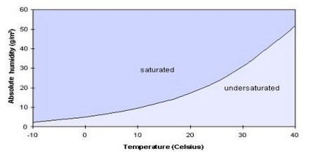 Figuur 1 toont de absolute luchtvochtigheid van lucht. De grafiek toont aan dat warme lucht meer waterdamp kan bevatten dan koele lucht. Mensen ervaren dit vooral op een hete zomerdag. Een koufront koelt warme lucht, wat resulteert in een tropische regenbui die veroorzaakt wordt doordat koude lucht niet zoveel vocht kan bevatten als warme lucht.