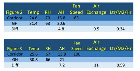 Bekijk figuur 2 voor een realistische weergave van de werking van luchtvochtigheid. In de kas is de temperatuur 31,4 °C en de relatieve luchtvochtigheid 66%. Op het eerste gezicht lijkt de situatie op figuur 3 de voorkeur te hebben aangezien zowel het vochtdeficit als de temperatuur hier lager zijn. Maar bij nader inzicht blijkt dat de ventilatorsnelheid in figuur 3 is verhoogd van 85% naar 100% in een poging om de temperatuur in de kas te verlagen. De lucht werd hierbij te snel door de klimaatkamer gedrukt en het water in de 'padmuur' heeft hierdoor geen kans gekregen om te verdampen. Hierdoor werd lucht met een lager watergehalte in de kas geblazen.