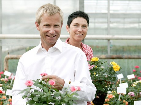 Rosa en Harley Eskelund. Hier in hun rozenkwekerij ongeveer 25 jaar geleden (Foto: Bjarni Jacobsen)