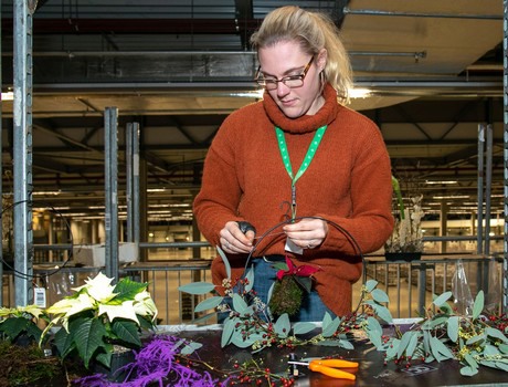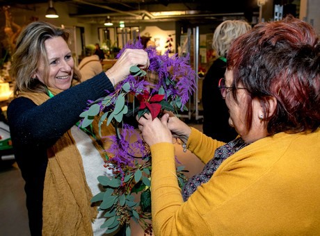Met deze ‘do’s and don’ts’ van het etaleren vers in het hoofd gingen de deelnemers vervolgens zelf aan de slag. In korte tijd resulteerde dat in verrassende arrangementen met Amaryllis of Poinsettia én een aantal hippe kerstkransen.