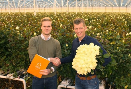 Vlnr: Koen Stigter (Product Manager Rose Dümmen Orange), Karel van Rijn (Bestuurder coöperatie Avalanche+ en teler)