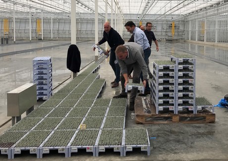 Voor de officiële aftrap op 6 december heeft het directieteam de mouwen opgestroopt en de eerste trays met Calocephalus stekken in de kas geplaatst.