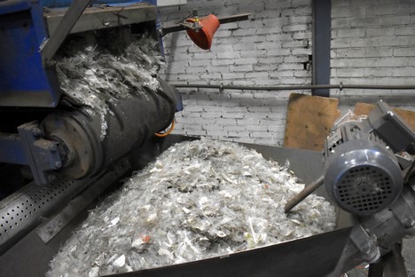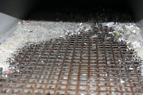 Het plastic wordt op een transportband gestort, waarna het naar de shredder getransporteerd wordt