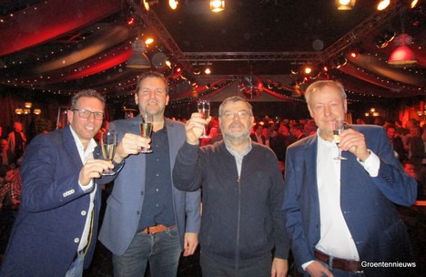 Xander van der Wilk, Jeroen Heemskerk, Michel Le Coz en Cees van Uffelen proosten met op de achtergrond een met bomvolle feestzaal.
