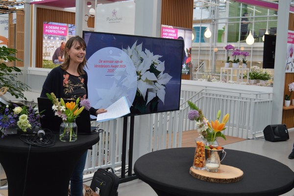 Astrid van der Helm van Glastuinbouw Nederland heeft zelf jarenlang deze bijeenkomst georganiseerd en mocht nu zelf de awards uitreiken.