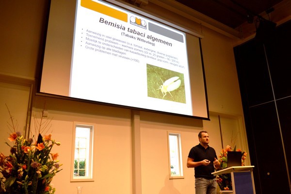 Aan de overkant ligt tegenwoordig het World Horti Center, alwaar men terecht kon voor lezing van Jeroen Sanders van Proeftuin Zwaagdijk. Hij ging in op een proef met bestrijdingsmiddelen tegen witte vlieg (Bemisia tabaci), in tal van gewassen een duiveltje, en zette de verschillende oplossingen van de verschillende leveranciers op een rijtje. Voornaamste les: mits juist gespoten zijn veel middelen en strategieën effectief in te zetten.