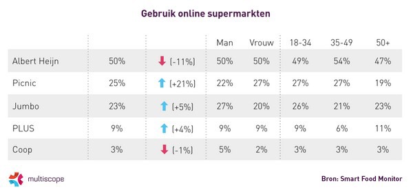Picnic is de grootste stijger van alle online supermarkten (+21%). Van de online bestellers doet één op de vier zijn boodschappen bij Picnic (25%). Hiermee blijft zij concurrenten zoals Jumbo (23%), PLUS (9%) en Coop (3%) voor. Ondanks een daling van 11% is Albert Heijn nog steeds de meest gebruikte online supermarkt (50%). Mannen hebben vaker een voorkeur voor Jumbo, vrouwen vaker voor Picnic.