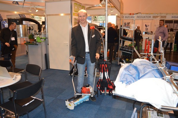 Christian Oosterlaan van HortiHands met de 'long handle version' van de EazyCut 400, waarmee zowel hoveniers als bijvoorbeeld kruidentelers kunnen 'maaien'.