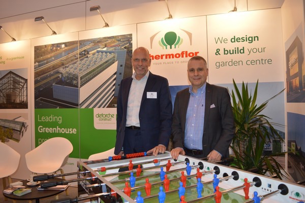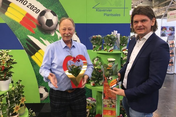 Gert Jan Kromhout van Klavervier Plantsales samen met kweker Jan Pieter van der Houwen van Amarantis. Gert Jan heeft een mooie kalanchoƫ in Valentijn verpakking en Jan Pieter showt de nieuwe verpakking om tijdens het EK dit jaar te verkopen.