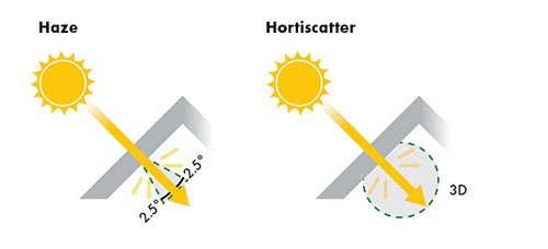 De mate van verstrooiing van licht door diffuse coatings en glas wordt meestal met Haze aangeduid. Dat is in de markt zo gegroeid. Het begrip Hortiscatter geeft echter meer informatie over hoe het licht verdeeld is.