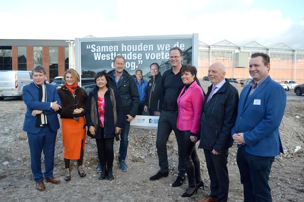 In aanwezigheid van deelnemende tuinders, hoogheemraad Manita Koop, wethouder Leen Snijders en Sjaak van der Tak namens Glastuinbouw Nederland werd gisteren het glas geheven op het aansluiten van de 25ste deelnemer, Lugt Lisianthus. Deze heeft een spiksplinternieuwe hightech kas van bijna 5 hectare laten bouwen en zijn waterbassin Rainlevelr-proof gemaakt. Niet geheel toevallig werd dan ook voor zijn deur het bord met de tekst ‘Samen houden we de Westlandse voeten droog’ onthuld.