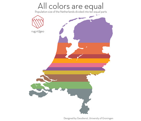 Onderstaande afbeelding van de Geodienst van de Universiteit van Groningen toont de kaart van Nederland, verdeeld over tien vlakken met gelijke inwonersaantallen. Voor de ruimte moet je duidelijk in het noorden zijn.