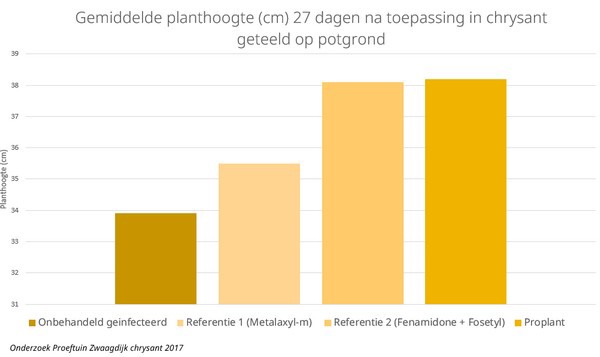 Uit onderzoek blijkt dat Proplant ten opzichte van referentie middelen vergelijkbaar presteert als het gaat om de parameters planthoogte in chrysant en versgewicht in tulp na een Pythium infectie. Onderstaande grafieken laten de resultaten zien. In beide gevallen zijn de substraten kunstmatig geïnfecteerd met Pythium. Behandeling bij tulp was direct na het aanplanten. Behandeling bij chrysant vond 1 dag na het aanplanten plaats.