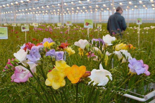 Freesia is geen hele grote teeltgroep, maar wel een wereldje op zich. Over de jaren is de bloem steeds verder veredeld en de teelt steeds verdere geprofessionaliseerd. Door belichting is hij jaarrond beschikbaar, maar je ziet dat de kwekers, die in aantal langzaam afnemen, steeds verder moeten investeren om een hogere productie en zwaardere kwaliteit te realiseren. Van de andere kant zijn er ook die er juist voor kiezen niet mee te gaan in de ratrace. Misschien geen lampen, misschien niet de meest fancy kas en misschien niet eens een jaarrond product. Soms combineren zij de freesia met andere teelten en kunnen er zo, dankzij de veel lagere input, ook een boterham mee verdienen.