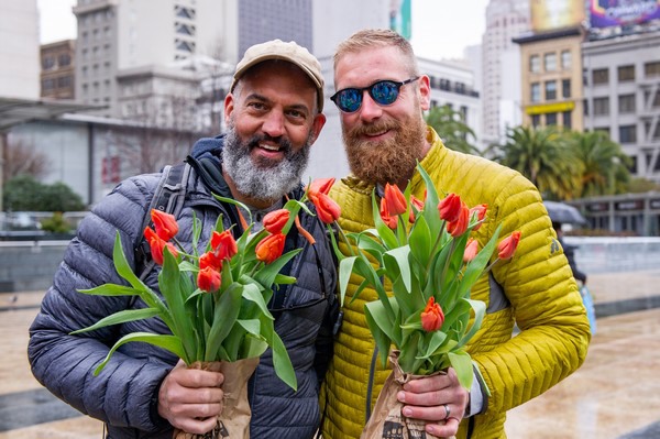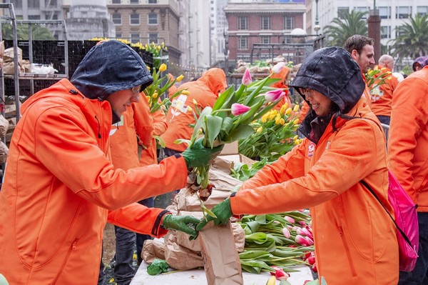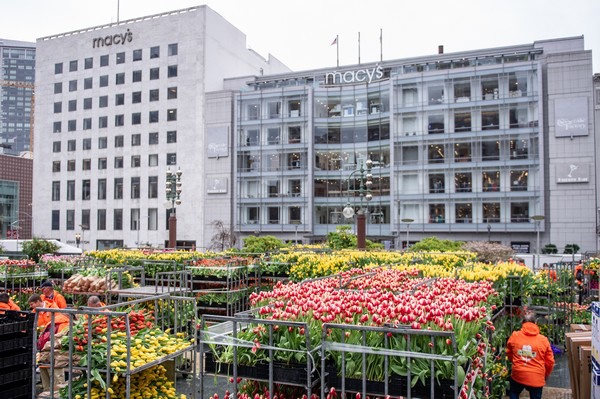 Op Union Square in San Fransciso zou afgelopen zaterdag, naar beproefd Amsterdams model, voor de tweede maal een tulpen pluktuin worden ingericht. Een man of 20 - 25 was uit Nederland afgereisd en bracht op vrijdag het plein in gereedheid. Ondertussen waren een zevental trucks met daarin 100.000 bloemen onderweg vanuit SunValley, een uur of 7 rijden.