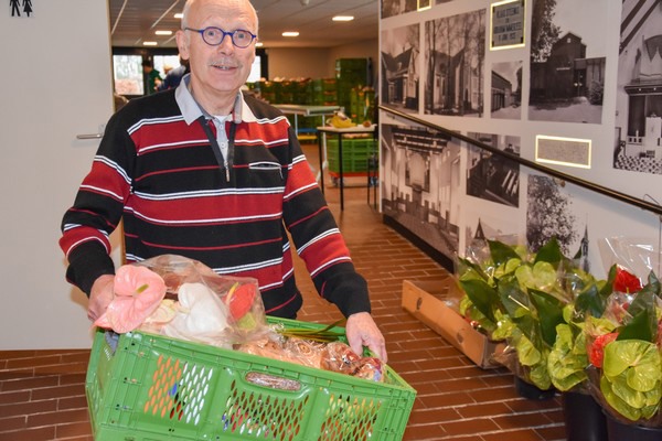 Vrijwilliger voedselbank Westand Frits Troost neemt de anthuriums in ontvangst