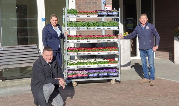 In deze barre tijden moeten we elkaar allemaal helpen en zeker de kwekers die harde klappen krijgen. Met een mooie kar bloeiende planten, mede door mijzelf geraapt en dat viel niet mee", grinnikt Jean-Pierre, "zijn we naar De Terwebloem gereden, een woonzorgcentrum in Poeldijk. Daar zijn we hartelijk, wel op minimaal 1,5 meter afstand, ontvangen door Petra en Annet en hebben Jan en ik de planten overhandigd."