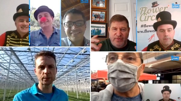Van linksboven mee met de klok: hoe groot ook de crisis, Juan David van Deliflor Colombia, hier in gesprek met John Elstgeest en Jose Manuel van de Colombiaanse kweker Capiro, is niet te beroerd voor een dolletje; Michael Black van Jet Fresh Flowers vertelt over de bloemhandel vanuit Miami; Peter Kertesz loopt met de kijker over de sierteeltmarkt in Kunming, China; en Wouter Duijvesteijn van Beyond Chrysanten, die in de serie de spits afbeet en vorige week de situatie op zijn bedrijf schetste.