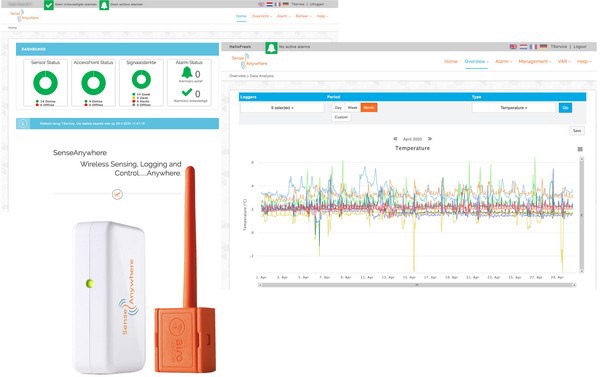 TService biedt temperatuurmonitors aan van diverse fabrikanten. Hiermee zit het bedrijf niet vast aan één leverancier en dat maakt ze flexibel. Een van de nieuwste systemen die het bedrijf aanbiedt op de markt is het SenseAnywhere, een IoT (Internet of Things) monitoringssysteem. “Dit is de volgende generatie in de wereld van temperatuurloggers,” vertelt Jochem. “Eigenlijk spreek je hierbij niet eens meer over loggers maar over monitoring. Een logger is een apparaat dat je van te voren programmeert en handmatig moet uitlezen, terwijl monitoring een volledig automatische oplossing aanbiedt. Dit systeem hebben we onder andere bij een Belgische teler geïnstalleerd die zijn velden heeft in Nicaragua, de producten bewaart in België en die monitort vanuit zijn kantoor in Singapore. Dit illustreert hoe dit systeem gebruikt kan worden door importeurs en exporteurs die hun koelhuizen overzee hebben staan en die vanaf een afstand makkelijk willen kunnen controleren en monitoren.”