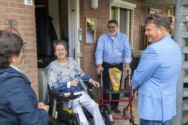 “Onze vrijwilligers hadden mooie persoonlijke Aandachtskaarten geschreven die wij bij de potzonnebloemen konden overhandigen op veilige afstand. We hadden veel bekijks, want Wolter en de cameraploeg trokken natuurlijk aandacht, dus de buren liepen ook uit. Het was zo ontroerend om mee te maken, de deelnemers was blij verrast en het was zo genieten van het mooie werk wat we met z’n allen doen”, aldus een tevreden Nelly.