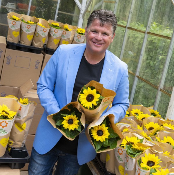 Het was ook een mooie samenwerking tussen Sunsation Sunflower, Red-je-boeketje en de Zonnebloem. Toen het verzoek voor de opnames van de prijsuitreiking van de VriendenLoterij reageerde Nelly Groothuis, voorzitter van de afdeling Wageningen direct enthousiast. Louis Kester van Sunsation kwekerscollectief: “Bij de Zonnebloemvrijwilligers draait het om mensen en de wil om iedereen volop van het leven kunnen laten genieten. Onze potzonnebloemen Sunsation brengen vrolijkheid, brengen ‘sunshine’ bij de mensen thuis of in de tuin, ook als het eens minder meezit. Daar willen onze kwekers aan bijdragen: Everyday Sunshine!” Daarom doneerden de kwekers 100 potzonnebloemen die de vrijwilligers samen met Wolter Kroes bij mensen met een lichamelijke beperking langs gingen brengen. Red-je-boeketje bood aan om de potzonnebloemen naar Wageningen te vervoeren. Jurre Bakx, HUB Manager bij Red Je Pakketje, vertelt waarom zij de actie ondersteunen: “Gehandicapte mensen zitten immers ook al weken binnen en zijn toch een beetje een vergeten groep in deze tijd."