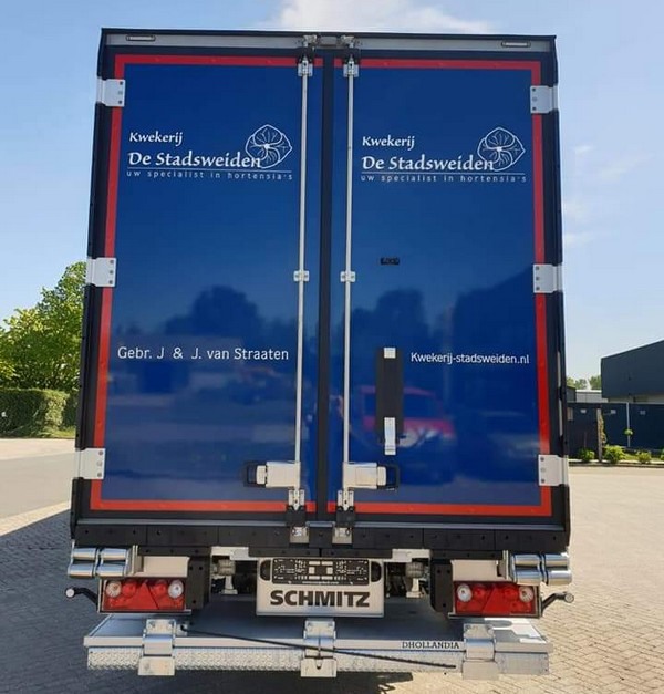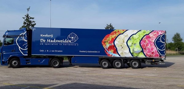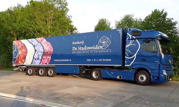"Het is weer een beetje mooier geworden op de weg", zo laat hortensiakwekerij De Stadsweiden trots weten. Vorige week heeft men een nieuwe vrachtwagencombinatie in ontvangst genomen: het nieuwste model Mercedes Actros (zonder spiegels, volledig met camera’s) met daarachter een Schmitz-trailer.