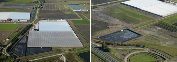 Project Dinteloord, bassins TOM/J.A.M. van Marrewijk bv links en Van der Kaaij bv rechts met de MULTI-F XXL 25.000m2. Meer dan 70.000 m² Alligatorfolie in combinatie met de drijvende afdekking MULTI-F. Op dit project is bij Van der Kaaij een MULTI-F XXL geleverd van 25.000 m², de grootste drijvende anti-alg afdekking ooit gemonteerd in Europa.