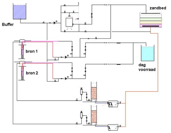 Codema heeft het principe van infiltratie in de glastuinbouw geïntroduceerd en is vrijwel het enige bedrijf dat met succes dit soort bronnen aanlegt. Van den Bosch legt de werking van de ondergrondse waterberging uit. ‘’Al het regenwater dat op het kasdek van Bunnik Vriesea’s terechtkomt wordt eerst door een mechanisch filter gepompt, daarna brengen we het de zandfiltersilo in. Deze is gevuld met een zandbed, bestaande uit drie lagen zand, van fijn bovenin, naar grof zand onderin. Als het water door het zandbed is gezakt, blijft het meeste vuil in de bovenste laag achter. Het schone water wordt met een klein pompje in de 3,5 meter hoge voordrukbuis gebracht’’, vertelt Van den Bosch. “Met die waterkolom bouwen we genoeg voordruk op, waarmee het water geleidelijk de ondergrond in zakt, naar een diepte van 15 tot 37 meter. Het water vormt een zoetwaterbel in het grondwater. De zoetwaterbel kan onbeperkt groeien, dus Bunnik Vriesea’s kan onbeperkt water opvangen en heeft te allen tijde de beschikking over schoon water. Ook als er al een tijd geen druppel regen is gevallen.’’