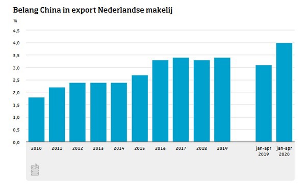 In de eerste vier maanden van 2020 is de export van goederen van Nederlandse makelij naar China met 500 miljoen euro gestegen tot 3,5 miljard euro. Dat is 16 procent meer dan in dezelfde periode in 2019. Vooral hightech machines en voeding zijn in China erg gewild.