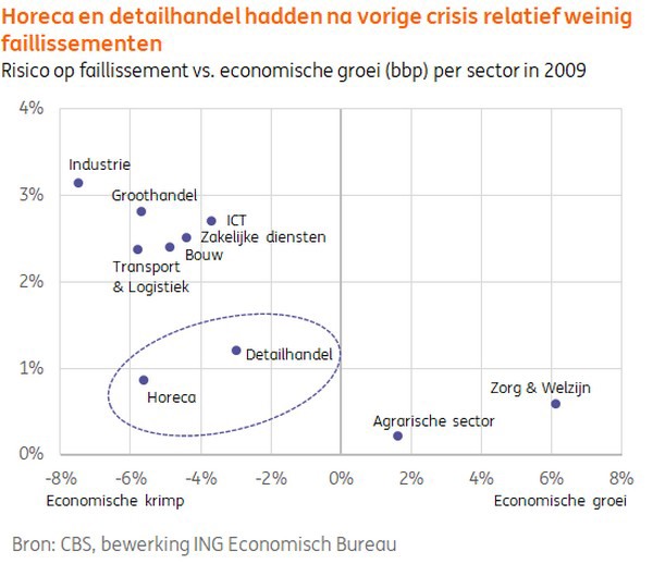 Door de coronacrisis kan het aantal faillissementen in 2021 verdubbelen of zelfs verdrievoudigen ten opzichte van 2019 berekende ING. De bank verwacht voor 2021 dat 1,5% tot 2,5% van de bedrijven bankroet gaat, wat neerkomt op 6.500 tot 10.000 faillissementen. In 2019 ging 0,8% van de bedrijven failliet. Ondanks de grote economische krimp wordt de schade beperkt door een aantal dempende factoren. Naast de overheidssteun hebben bedrijven zelf meerdere mogelijkheden om het omzetverlies (deels) op te vangen door variabele kosten te verlagen en snel afscheid te nemen van flexibel personeel. Bovendien zijn zwaar getroffen sectoren als de horeca en detailhandel minder gevoelig ten opzichte van andere sectoren voor faillissementen doordat zij relatief weinig kapitaalgoederen hebben.