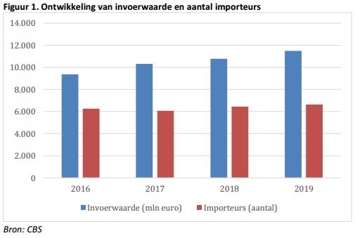 De Nederlandse tuinbouw 'leeft' van de export, maar dat neemt niet weg dat er ook flink wat ingevoerd wordt. In totaal werd er door alle handelsbedrijven, telers, toeleveranciers en techniekbedrijven in groenten, fruit en sierteelt voor 11,5 miljard euro Nederland binnen gehaald, 23% meer dan in 2016 (9,4 miljard euro). Ook het aantal importeurs steeg, van 6256 in 2016 naar 6633 in 2019, zo blijkt uit de Tuinbouwcijfers 2019 van het Centraal Bureau voor de Statistiek (CBS) en onderzoeksinstituut Wageningen Economic Research.