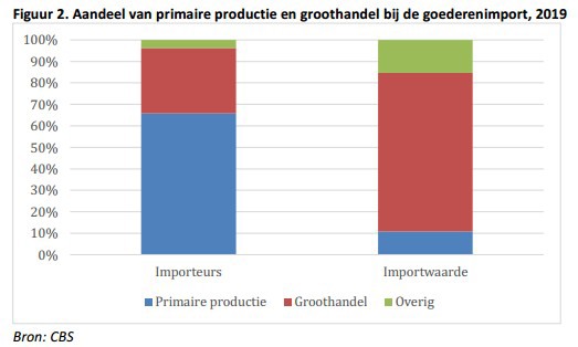 Maar liefst 74 procent van de totale invoerwaarde in 2019 betreft invoer door bedrijven in de groothandel. Een veel kleiner aandeel (11 procent) betreft directe import door bedrijven in de primaire productie.