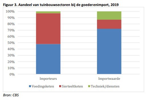 De voedingsketen (met name groente en fruit, inclusief groothandel) en de sierteeltketen zijn verantwoordelijk voor het overgrote deel van de import, geen verrassing voor de exportgeoriënteerde sector die de Nederlandse tuinbouw vooral is. Van het totale aantal