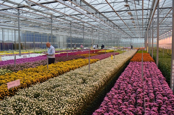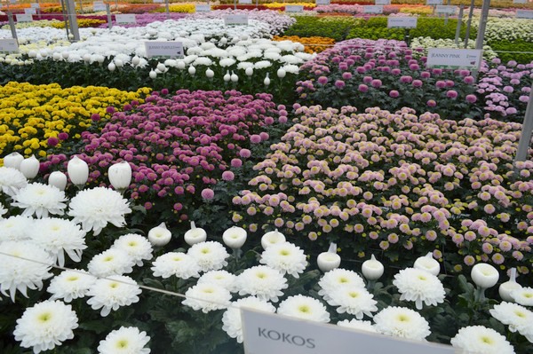 Traditioneel rond deze tijd van het jaar organiseert Dekker Chrysanten op het bedrijf in Hensbroek een uitgebreide bloeiproef. Meer kleurtjes bijeen in één kas vind je eigenlijk nergens; het assortiment chrysanten is enorm, in santini’s is men zelfs marktleider en zet je alles bij elkaar, dan waan je je in een fantastische snoepwinkel.