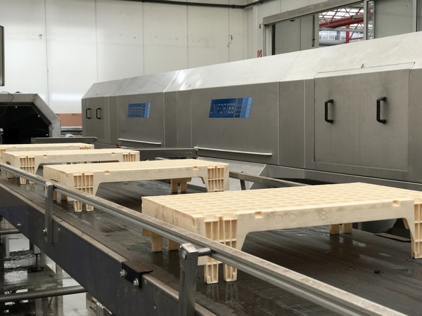 Nadat de trays ontstapeld zijn worden de trays automatisch aangevoerd. Ze gaan eerst door de voorwaszone waarna ze aankomen bij de hogedrukmodule. "Hier wordt middels hoge druk het grove vuil verwijderd, waarbij je moet denken aan pluggen die nog niet verwijderd zijn maar ook algen die op de trays zijn gaan groeien."