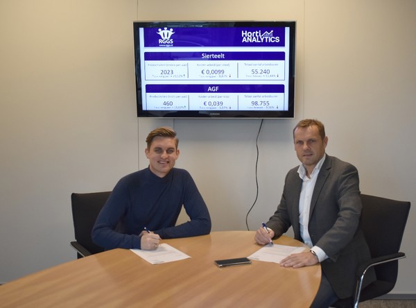Willem Verwoerd van Custo & Partners en Ricardo Prins van Horti Analytics tekenen de samenwerkingsovereenkomst