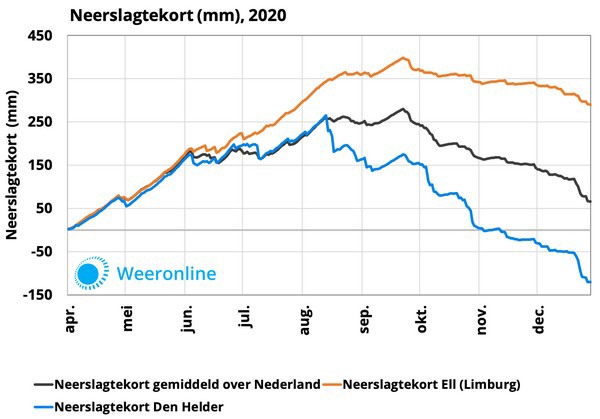 Gemiddeld over Nederland bedraagt het neerslagtekort nu 66 mm. Omdat dagelijks verspreid over het land neerslag valt en er nauwelijks water verdampt in deze tijd van het jaar, loopt het tekort wel snel terug. In de natste gebieden is al een tijdje sprake van een neerslagoverschot. Daarbij is er meer neerslag gevallen dan er aan water is verdampt. Het natst is het op dit moment in het noordwesten. Zo is in Den Helder al sprake van een overschot van 120 mm. Het verschil met het zuidoosten is enorm. In het Limburgse Ell is het tekort nog altijd bijna 300 mm.