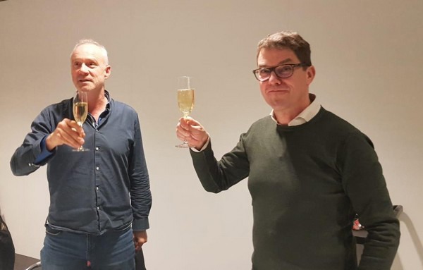 Herbert Wooning (links) en Arco van der Kaaij heffen het glas na de overname van Wooning Orchids door Green’05.