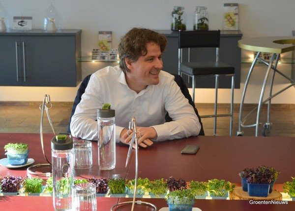 Henri op de stoel aan tafel bij Koppert Cress, waar eerder o.a. Carola Schouten en Phil Hogan hem voorgingen.