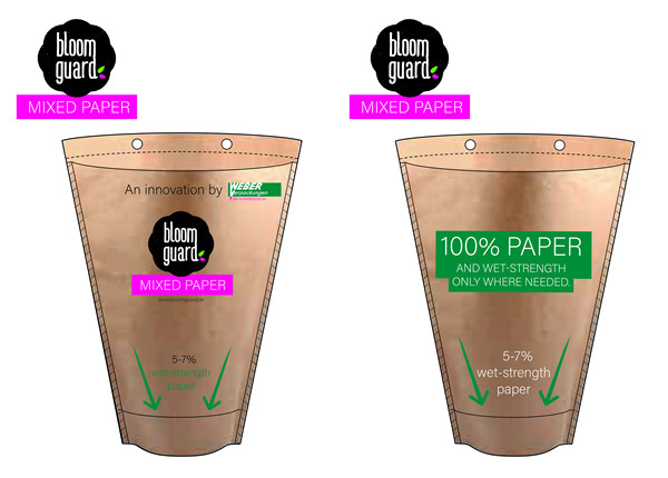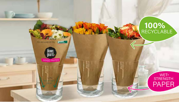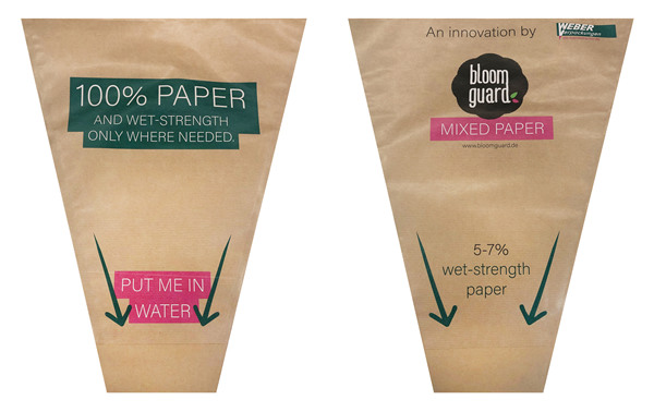 "De meeste papieren bloemenhoezen bestaan uit gestreept, bruin Kraftpapier. Bij bloemen die lange tijd in water staan, zie je echter vaak dat de verpakking zachter wordt en kan scheuren. Daarom hebben we nu een nieuwe verpakking geïntroduceerd, waarbij het gestreepte Kraftpapier wordt gecombineerd met een onderlaag van 5-7% nat-sterk papier", vertelt verpakkingsadviseur Olaf Amende. "We hebben door middel van een intelligente technische aanpassing een nieuwe papiercombinatie als alternatieve optie aan het assortiment toegevoegd. Zo combineren we het beste van twee werelden. We behouden een betaalbare duurzame papieren hoes en tevens de optimale presentatie”.